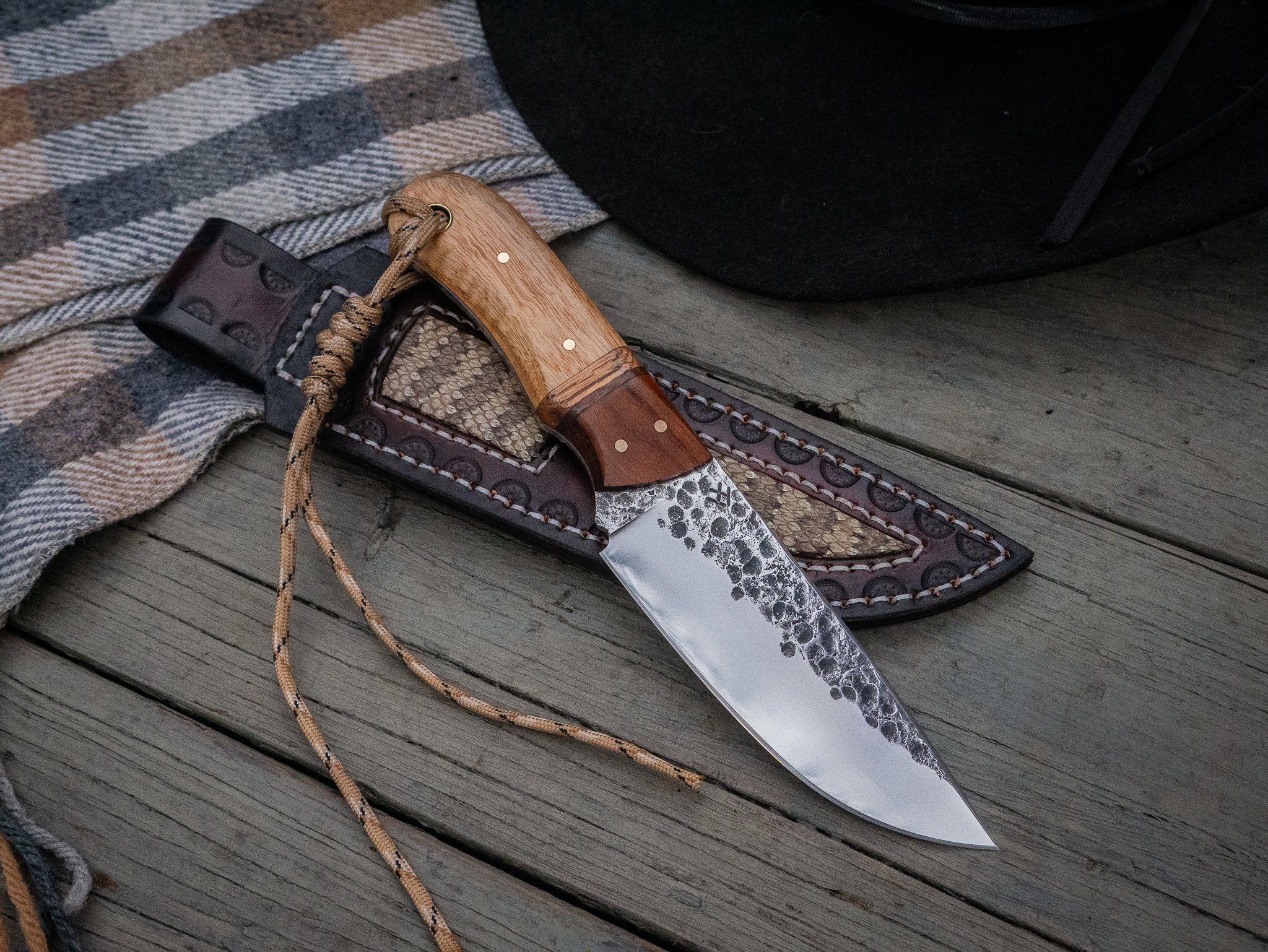 This Go Mai knife was hand forged from a five layer construction of high-carbon steel (1095 Exterior, 52100 Edge) and copper, creating a blade that offers striking aesthetics. The copper layer in the knife surprisingly doesn't hinder the knife's durability, essentially laminating to the steel in the forging process. This knife is sharp as a razor and durable for piercing and whittling tasks. A great every day carrier or heirloom piece. The accompanying leather sheath was handmade by The Rainy Forge as well, and features authentic Diamondback rattlesnake skin inlays.